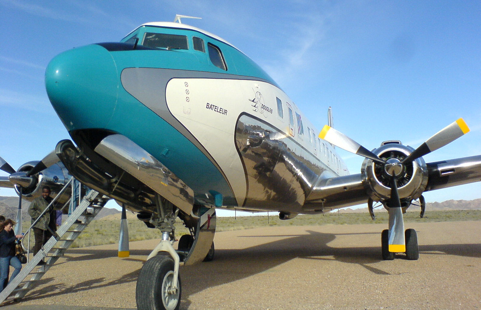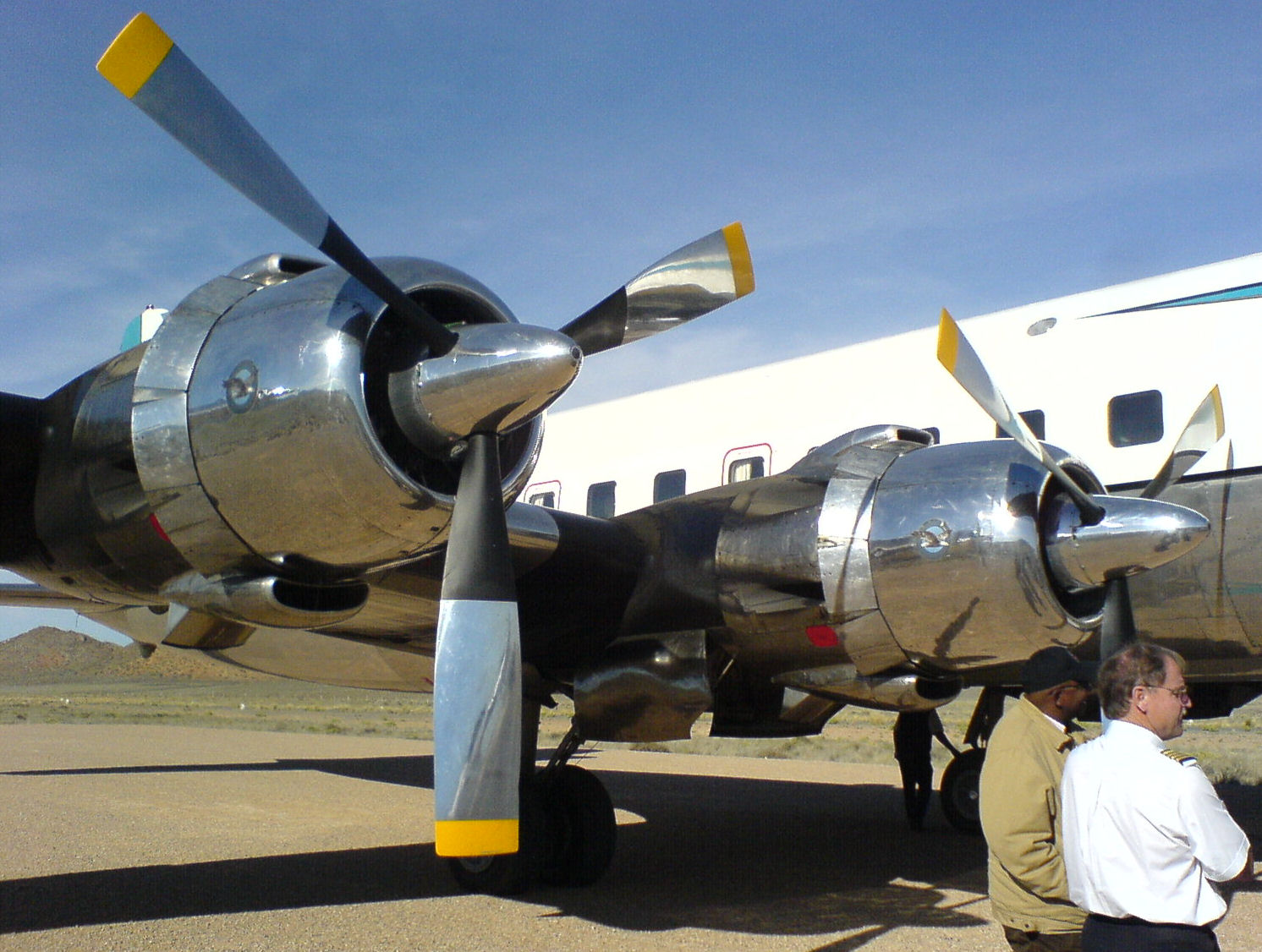 I was very lucky to be sent to a conference in Swakopmund in August 2007. Part of the conference was made up of site visits to various mines and metallurgical plants. Being a rather large place, a lot of travel in Namibia is by air. One of the site visits was to Skorpion Zinc, which is very close to the southern border of Namibia, and the other one was to Tsumeb, which is about 3/4 of the way to the northern border. The first trip was for about 50 people, for which one needs a rather large aircraft, or several smaller ones. When we all arrived at Swakopmund airport early in the morning, we found a restored Douglas DC-6B sitting on the apron.