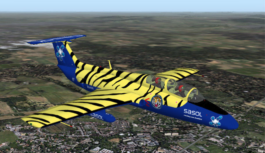 So far I have repainted Tim Conrad's Aero Vodochody in the colours of the Sasol Tigers aerobatic team (ZU-CYI). The team were very helpful in giving me access to the aircraft and giving me flying tips for the review I was doing. The repaint and Tim's base files are available at Avsim and Flightsim.